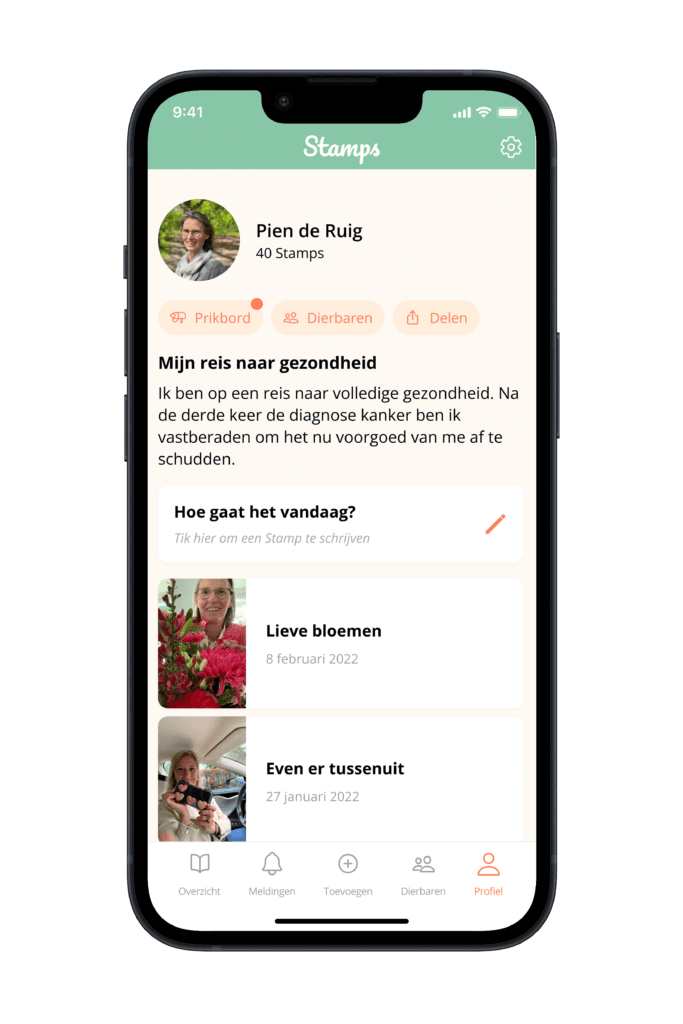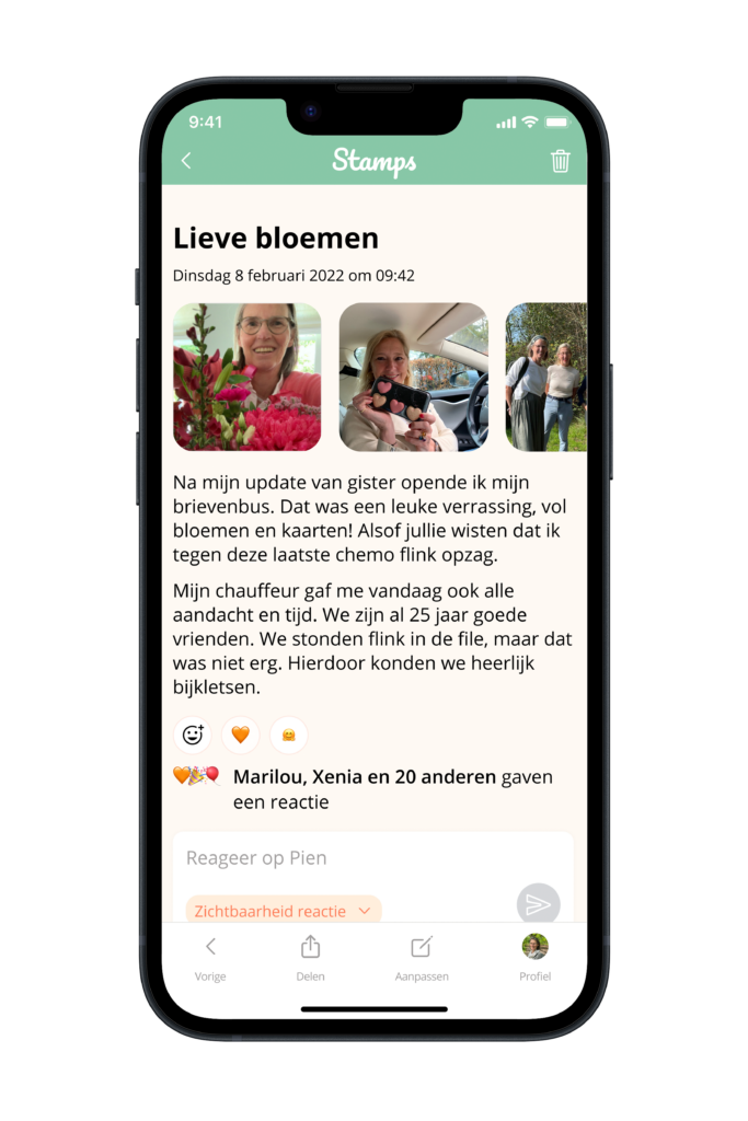 Je hebt niet altijd tijd, energie of zin om hetzelfde verhaal te vertellen. Of te reageren op al die goedbedoelde appjes. Je wilt ook wel eens over andere, alledaagse gebeurtenissen praten. En weten hoe het met die ander gaat. In Stamps deel je jouw verhaal in één keer.