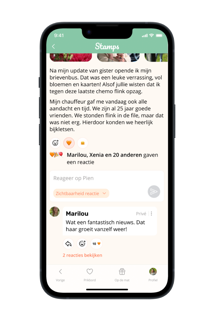 Het contact met vrienden en familie en hun steun is essentieel als je emotionele tijden doormaakt. Via Stamps blijven ze eenvoudig op de hoogte zonder erom te hoeven vragen. Ze kunnen er eenvoudig een reactie achterlaten, openbaar of in privé, of een kaartje sturen naar een persoonlijk prikbord.