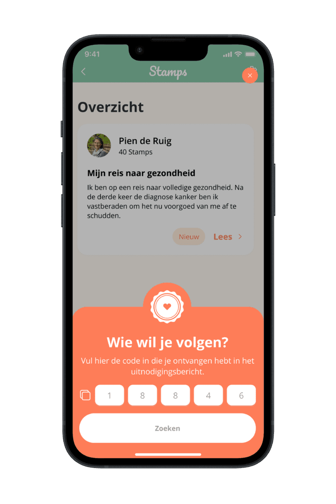 Alleen mensen die jij je unieke volgcode geeft, kunnen een volgverzoek doen. En dat kun jij accepteren of afwijzen. Zo blijft het jouw veilige plek.